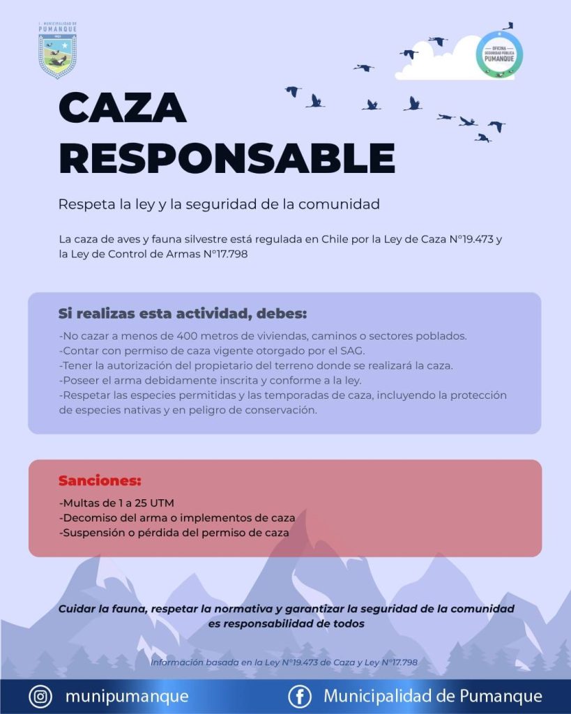 La Oficina de Seguridad Pública de Pumanque llamó a la comunidad a practicar una caza responsable, advirtiendo que disparar cerca de viviendas o zonas pobladas representa un grave riesgo y constituye una infracción a la ley.