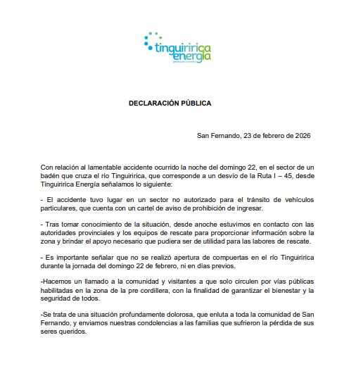 La hidroléctrica Tinguiririca Energía emitió un comunicado este lunes negando que, el pasado domingo hayan abierto compuertas en el momento que se registró la tragedia donde murieron dos personas adultas y una niña por al arrastre de la corriente del río hacia un auto que intentaba cruzarlo.